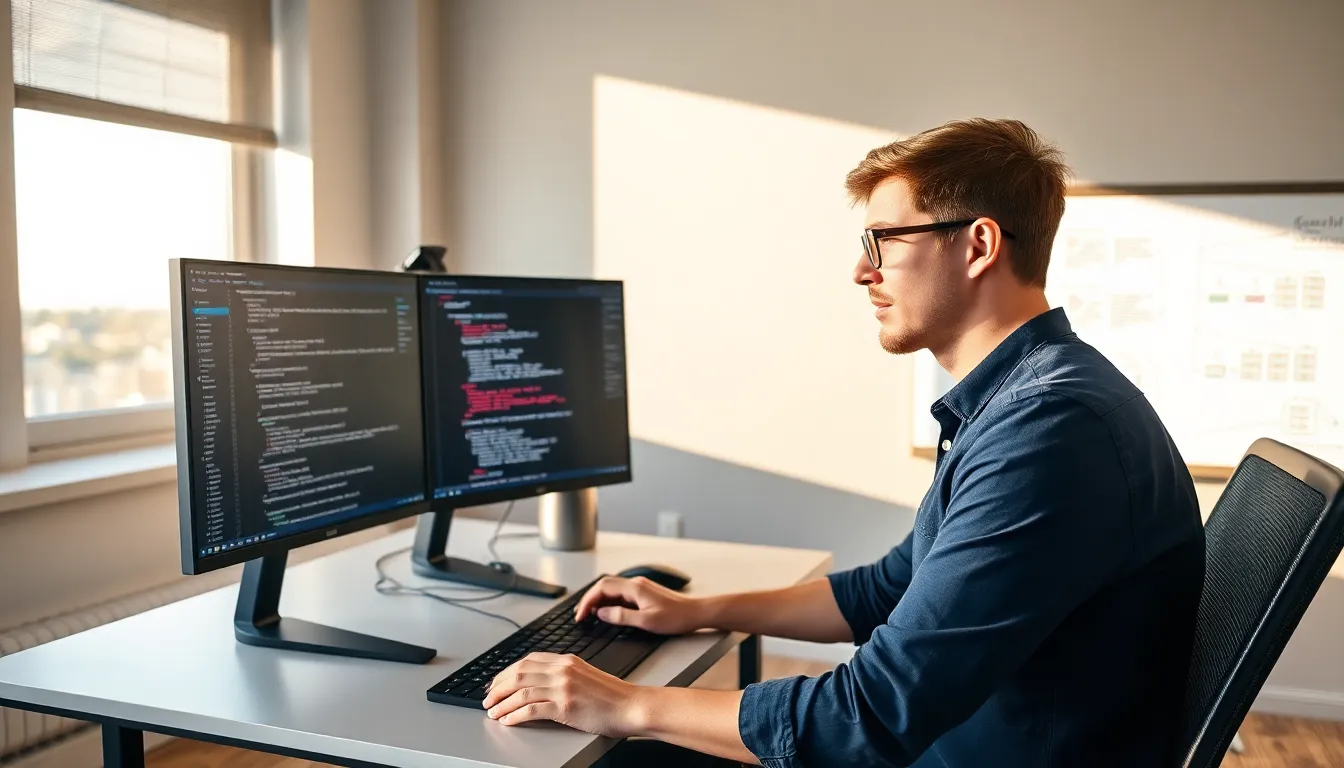A young man working on a computer in a modern home office.
